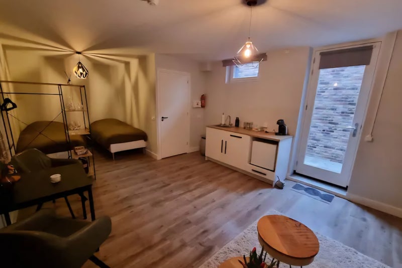 Ons gezellige appartement ligt onder ons huis in Ede en heeft een eigen ingang via een trap aan de zijkant. Het is knus en compleet ingericht: 2 losse bedden, een comfortabele zithoek, eettafel voor 2, een moderne badkamer en een kleine keuken met alles wat je nodig hebt, inclusief Dolce Gusto koffieapparaat.